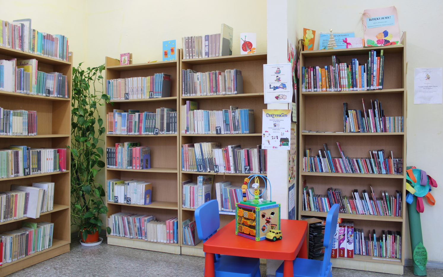 Jesteśmy jedyną dziecięcą biblioteką na Prawobrzeżu. Znajdziecie nas na Osiedlu Majowym, nieopodal Szkoły Podstawowej nr 37. Brak barier architektonicznych sprawia, że filia jest łatwo dostępna dla maluszków oraz dla wielu Czytelników odwiedzających bibliotekę z dziećmi w wózkach. Nasz obszerny księgozbiór, systematycznie uzupełniany o nowości wydawnicze, to w przeważającej części literatura dla dzieci i młodzieży. Jesteśmy też doskonale zaopatrzeni w lektury szkolne, a także możemy się pochwalić pokaźnym zbiorem audiobooków dla dzieci. Jako jedyna filia posiadamy do wypożyczenia nuty.