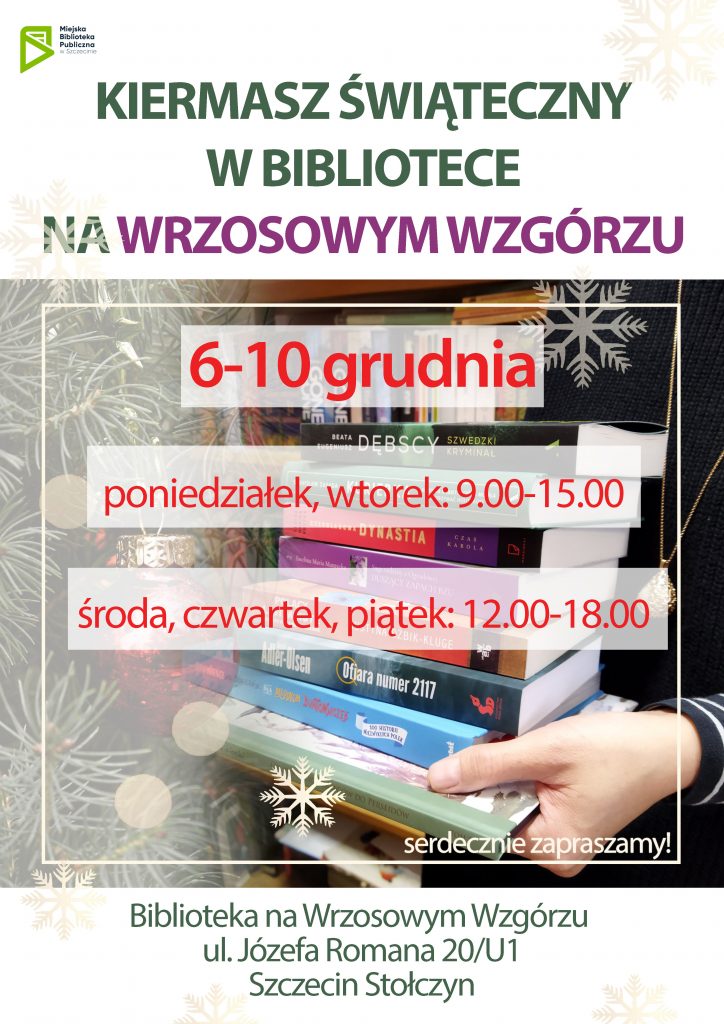 Zapraszamy do filii na Wrzosowym Wzgórzu (ul. Józefa Romana 20/U1) na świąteczny kiermasz książek w dniach 6-7 grudnia w godz. 9.00-15.00 oraz 8-10 grudnia w godz. 12.00-18.00. Każdy znajdzie dla siebie lub bliskich ciekawą lekturę.