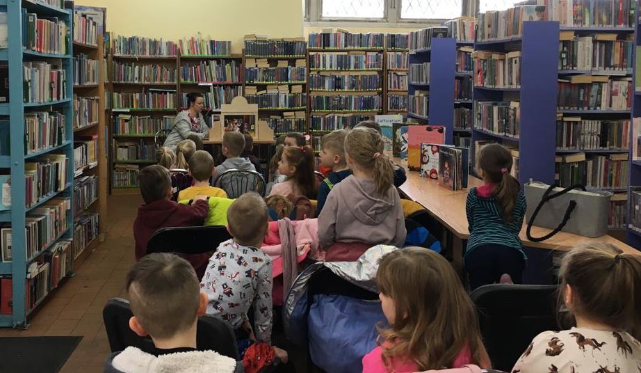 Razem z małymi gośćmi pani Asia z biblioteki rozmawiała o bajce odtworzonej w teatrzyku kamishibai „Noc w bibliotece” oraz co dzieje się w wypożyczalni książek nocą, gdy nie ma w niej już czytelników a ostatni bibliotekarz zamknie drzwi na klucz.