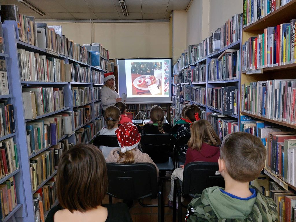 Uczestnicy poznawali zwyczaje bożonarodzeniowe dzięki pogadance oraz prezentacji multimedialnej. Mali czytelnicy dowiedzieli się jakie tradycje panują w Niemczech (kalendarz adwentowy, bombki w kształcie ogórków), we Włoszech (szopka bożonarodzeniowa – presepe, czarownica Befane), w Wielkiej Brytanii (Santa Claus, pudding świąteczny), w Hiszpanii (górnik Olentzero, Caga Tio), w Meksyku (świąteczna piniata), we Francji (Gwiazdor, buche de Noel) i Australii (bałwany z piasku, sanie ciągnięte przez kangury).
