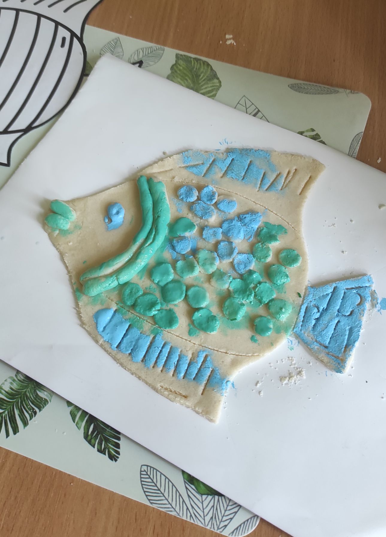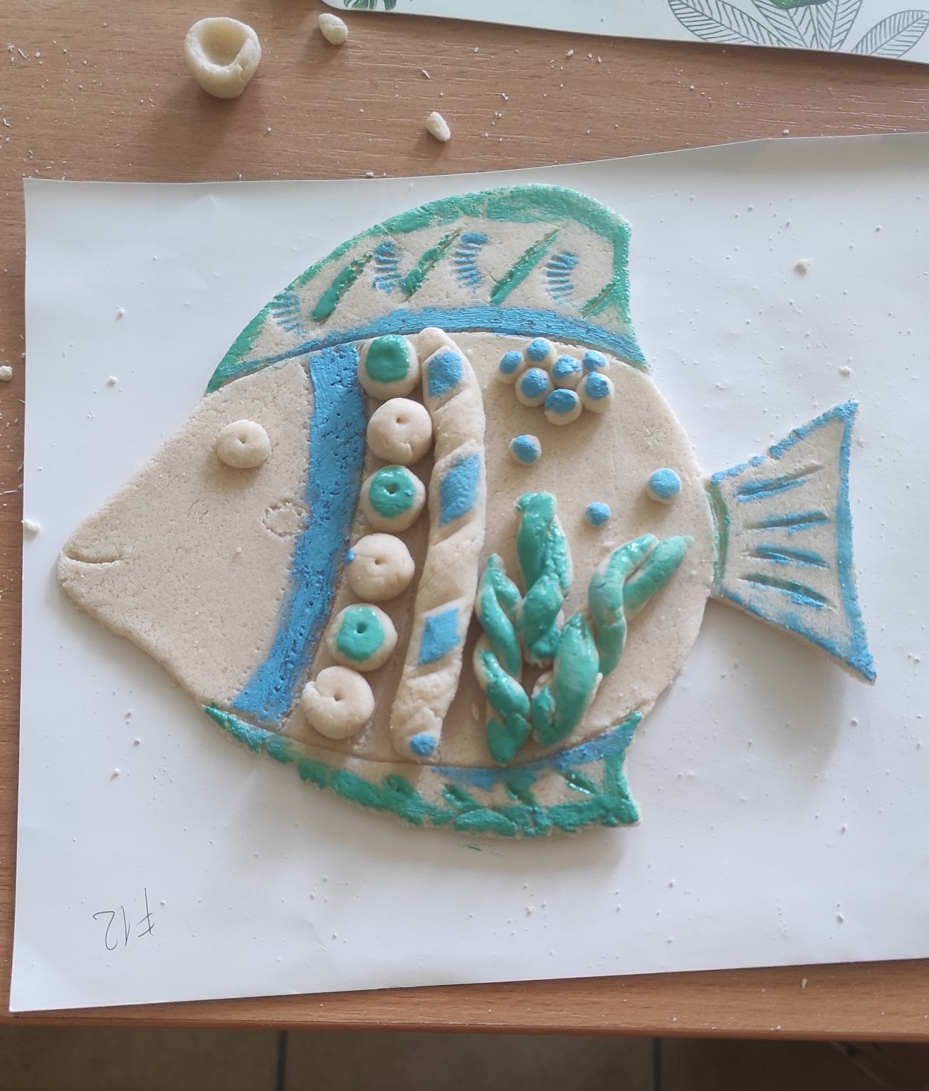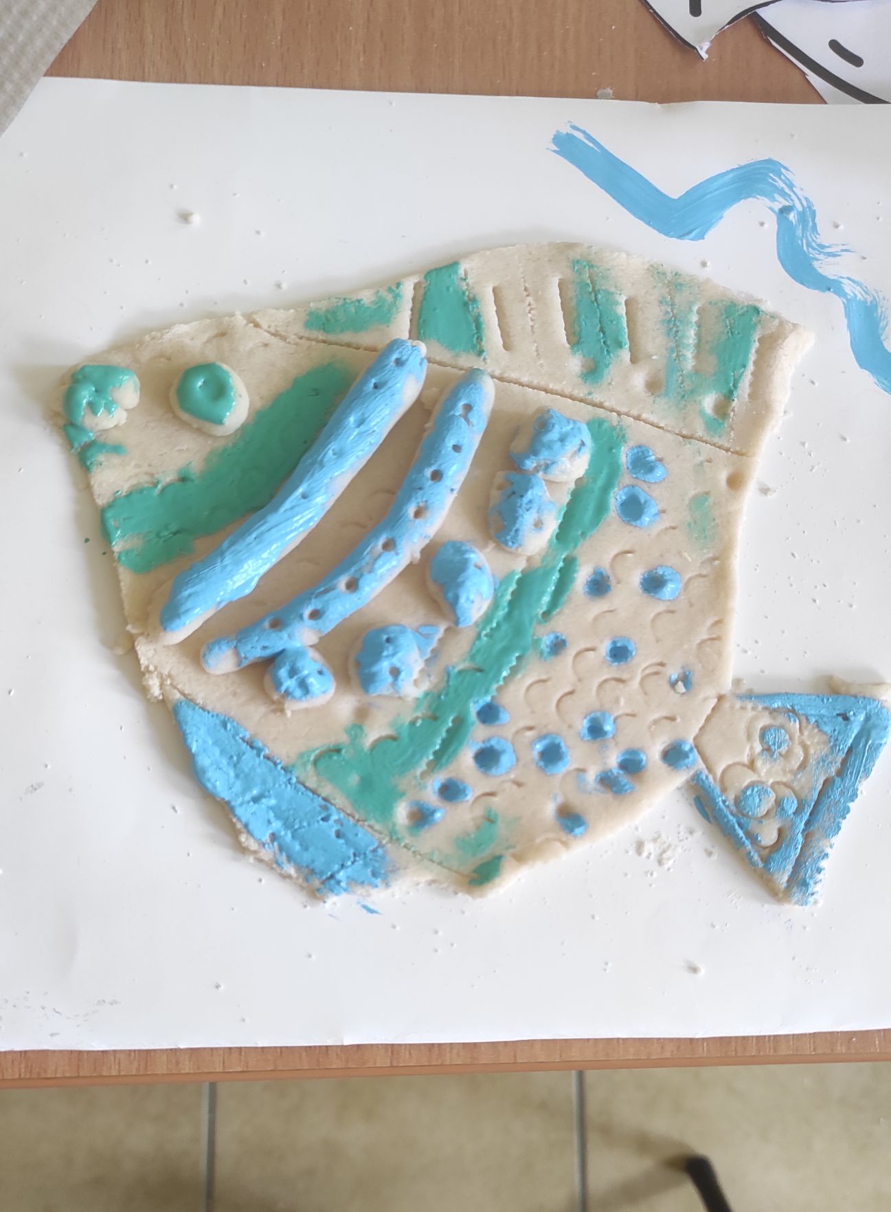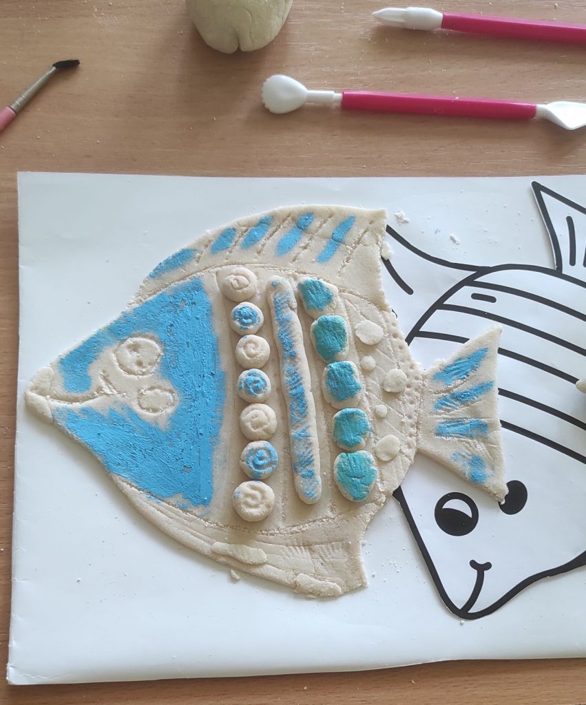 Stworzyliśmy płaskorzeźbę kotka z wąsikami i haczykiem po powieszenia, którą następnie pomalowaliśmy farbami, ślicznego baranka z kłębiastym futrem, płaskorzeźbę rybki pomalowaną na niebiesko i zielono.