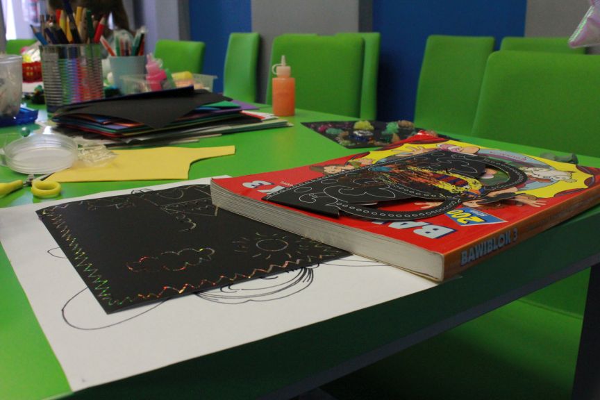 Między lekcjami mali uchodźcy spędzali czas wolny w Klubiku wielokulturowym w ProMediach i razem z Gulshod Chorshanbievą oraz Maszą rysowali, malowali i rozwiązywali łamigłówki i rebusy.