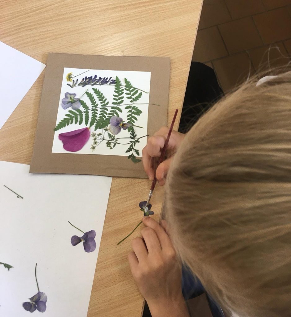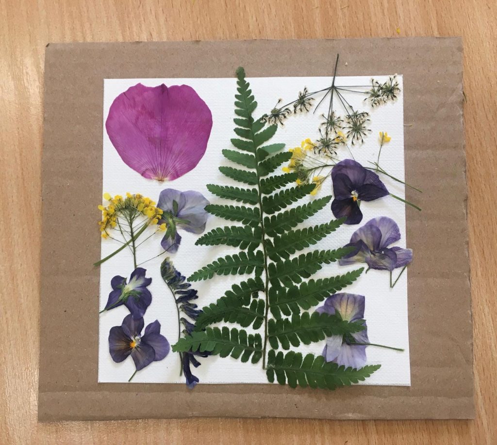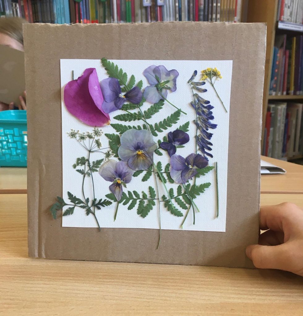 Praca plastyczna polegała na wykonaniu obrazków z zasuszonych kwiatów.
