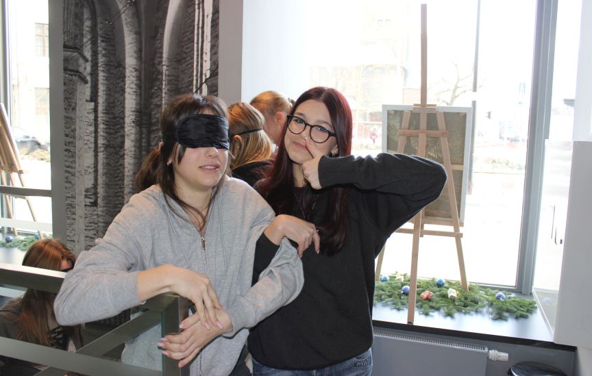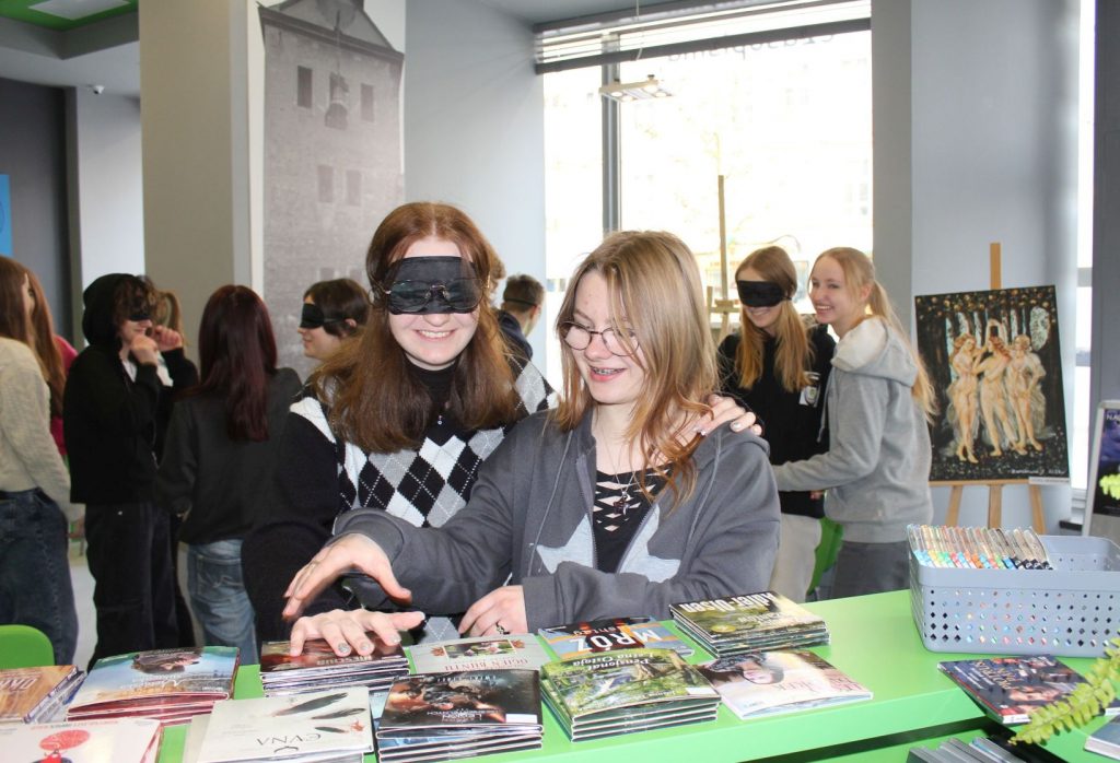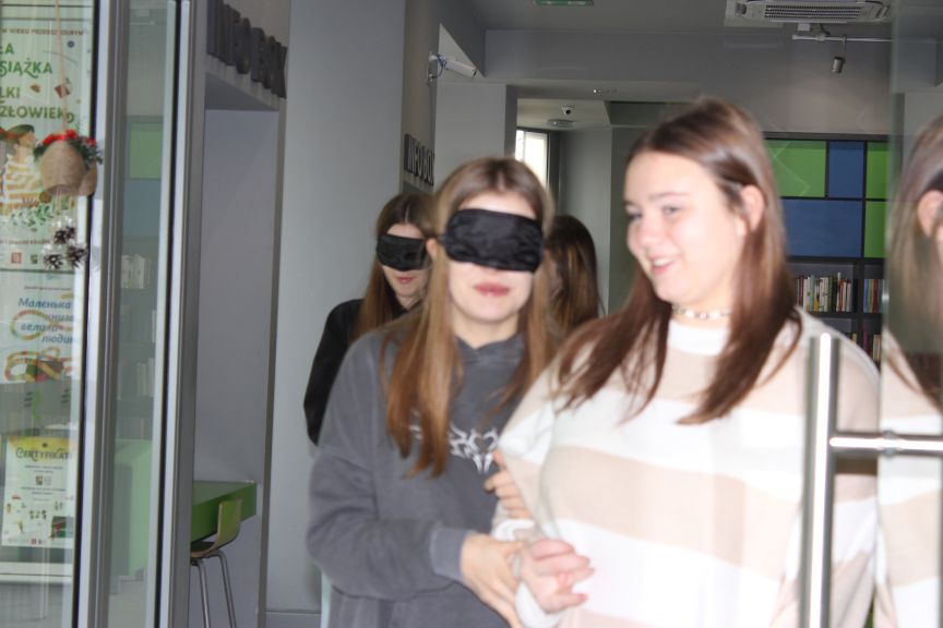 Poznali zasady komunikacji z osobami z niepełnosprawnościami i praktycznie przećwiczyli w przestrzeni biblioteki, jak należy pomóc osobie niewidomej spotkanej na ulicy, jak wskazać jej miejsce w tramwaju,