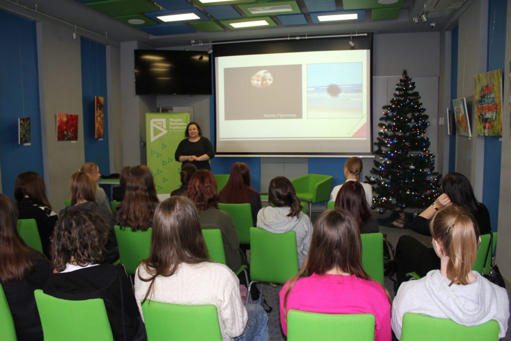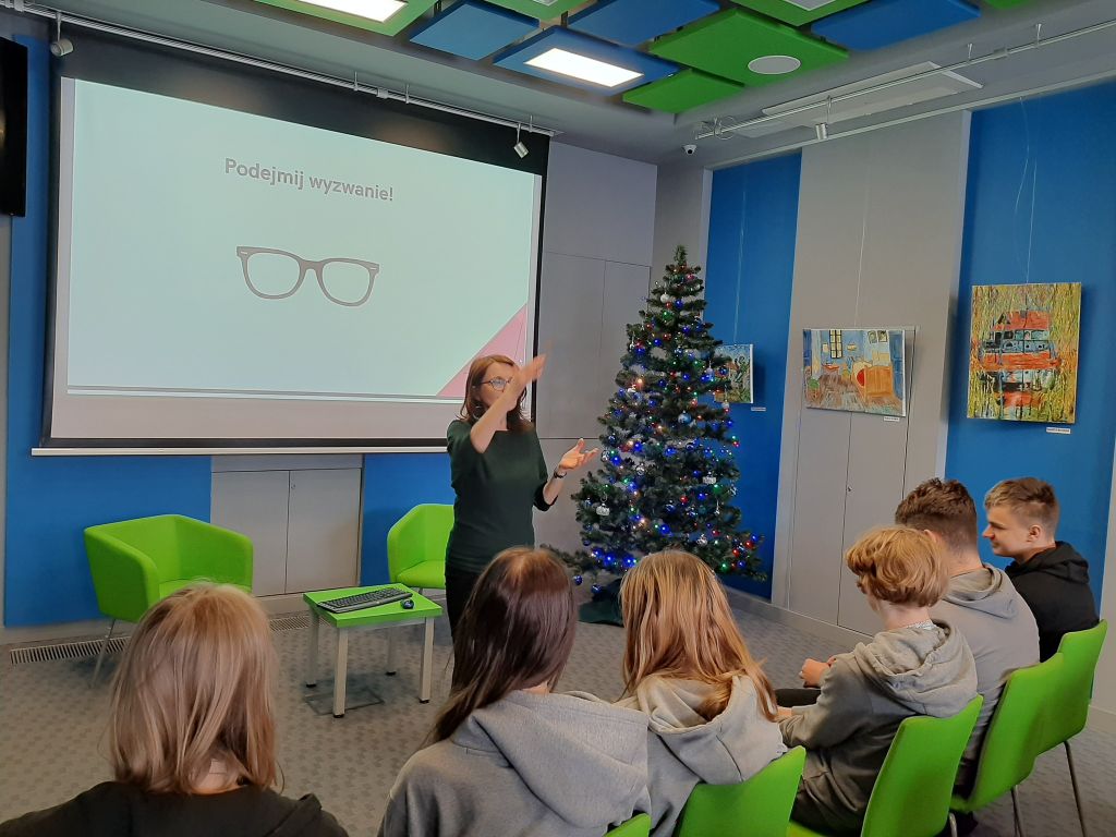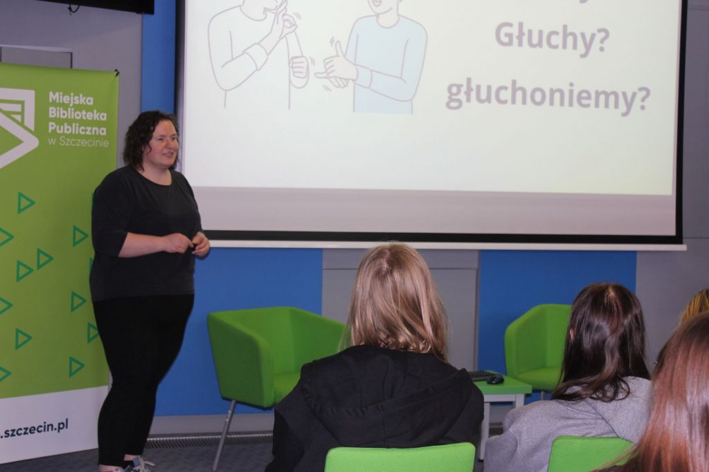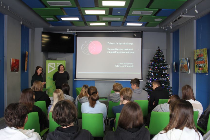 Młodzież wzięła udział w szkoleniu dotyczącym osób z niepełnosprawnościami, które poprowadziły nasze pracowniczki: Katarzyna Krawczyk – kierowniczka filii i Anna Rutkowska – kierowniczka działu promocji
