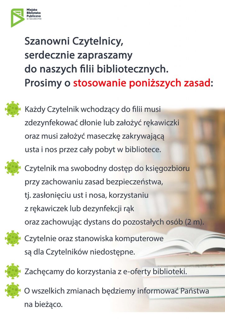 Możliwe jest wypożyczanie i zwracanie książek i płyt. Dla Czytelników nie są dostępne czytelnie, ani stanowiska komputerowe. Każda osoba przychodząca do biblioteki zobowiązana jest do zdezynfekowania rąk oraz noszenia maseczki. Należy też zachować odstęp 2 m od innych Czytelników. Niedozwolone jest korzystanie z biblioteki przez osoby wykazujące oznaki choroby.