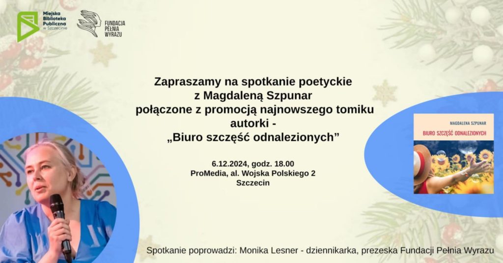 Rozmowę, przy okazji premiery wydania tomiku poezji pt. “Biuro szczęść odnalezionych”, poprowadzi Monika Lesner — prezeska Fundacji Pełnia Wyrazu.