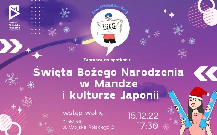 Klubu Miłośników Mangi „Isekai”, gdzie swobodnie porozmawiamy na temat grudniowych świąt w mandze i kulturze Japonii. A na koniec wszyscy chętni zmierza się w zimowym anime bingo z nagrodami.