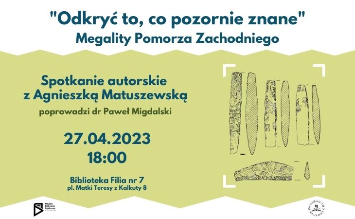 27 kwietnia (czwartek) o godz. 18:00 w filii nr 7 (pl. Matki Teresy z Kalkuty 8) zapraszamy na spotkanie promujące książkę „Odkryć to, co pozornie znane. Megality Pomorza Zachodniego”. Gościnią będzie jej autorka — dr Agnieszka Matuszewska z Instytutu Historycznego Uniwersytetu Szczecińskiego.
