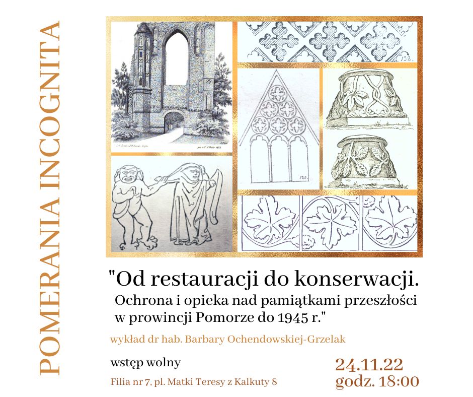 24 listopada (czwartek) w filii nr 7 (pl. Matki Teresy z Kalkuty 8) o godz. 18:00 w cyklu [Pomerania incognita] wykład pt. “Od restauracji do konserwacji. Ochrona i opieka nad pamiątkami przeszłości w prowincji Pomorze do 1945 r.” wygłosi dr hab. Barbara Ochendowska-Grzelak z Instytutu Historycznego US.