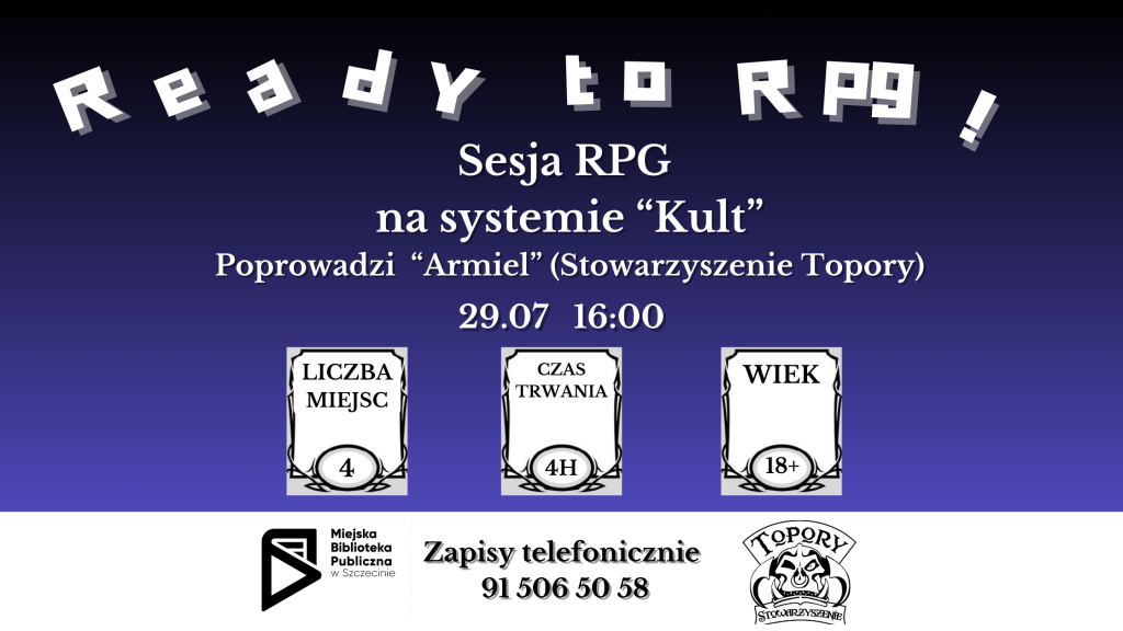 Już 29 lipca (pn.) o godz. 16:00 w filii nr 7 (pl. Matki Teresy z Kalkuty 8) będziecie mogli zagrać u nas w RPG-a z gatunku horror.