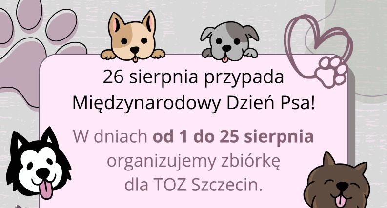 26 sierpnia przypada Międzynarodowy Dzień Psa! Z tej okazji w dniach od 1 do 25 sierpnia, organizujemy zbiórkę dla Towarzystwa Opieki nad Zwierzętami Szczecin.