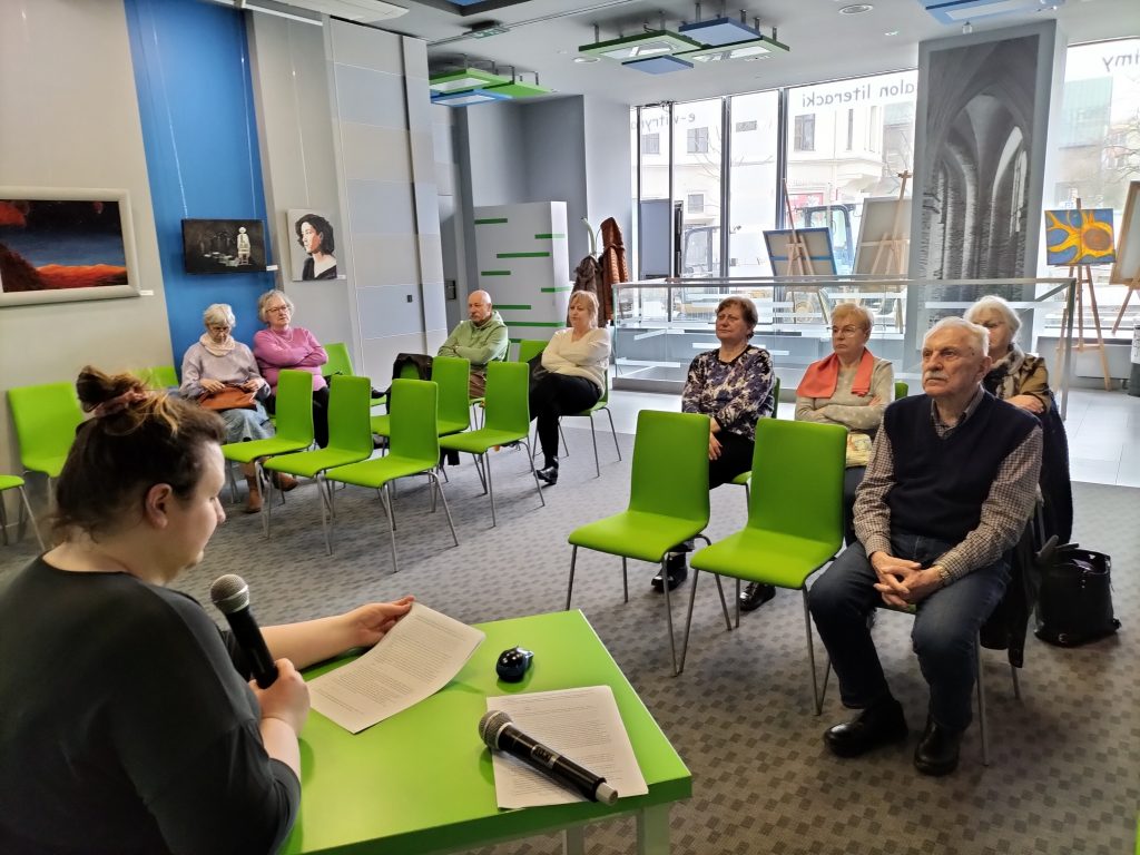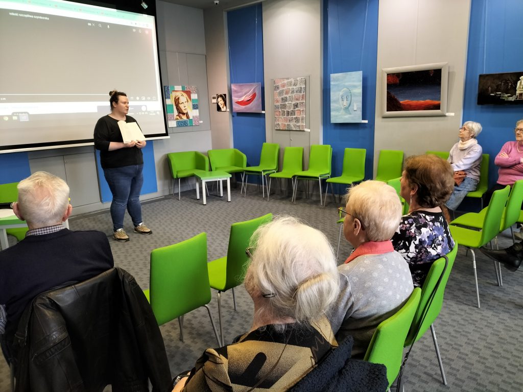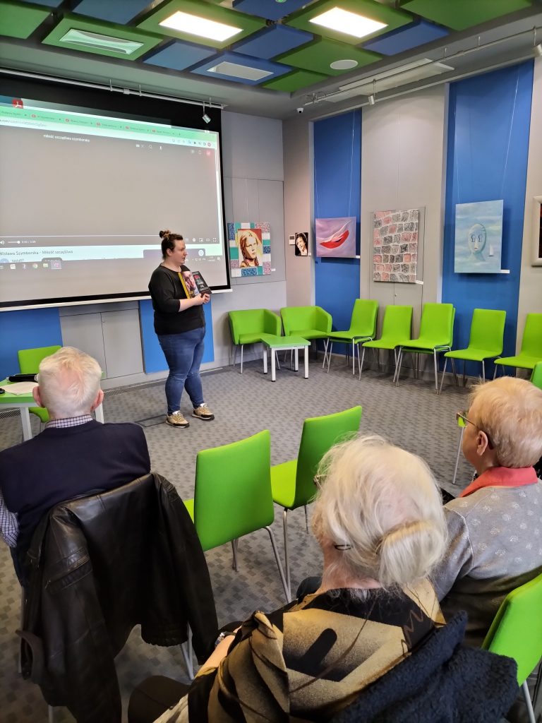 W drugiej części spotkania zagłębiliśmy się w życie i twórczość Wisławy Szymborskiej. Wspólnie wysłuchaliśmy wspomnień Michała Rusinka oraz wierszy poetki.